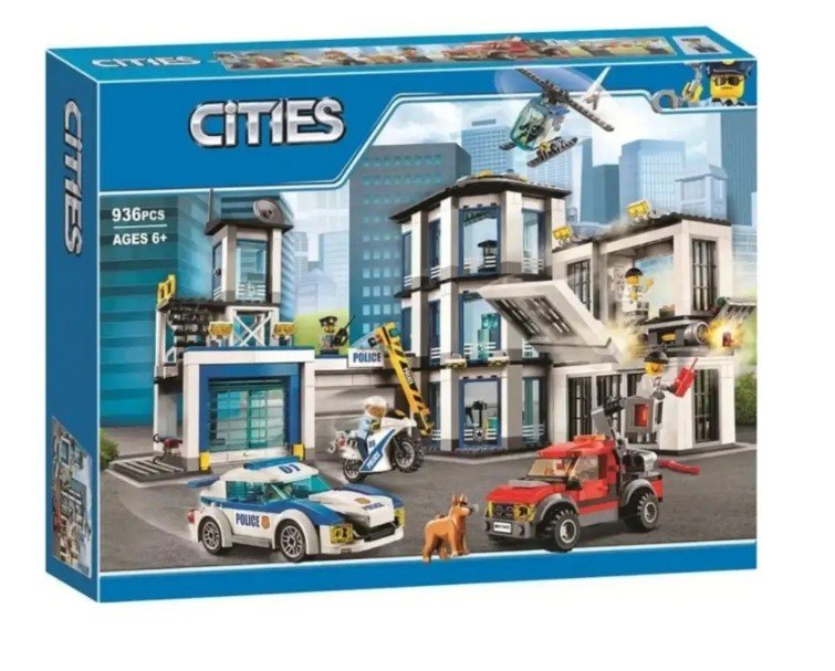 Из деталей набора собирается трехэтажное здание участка, на крыше которого размещается вертолетная площадка. С правой стороны к основному корпусу примыкают камеры для содержания заключенных, выстроенные в два яруса. С левой стороны - гараж на одну полицейскую машину, над которым располагается башня наблюдательного пункта.